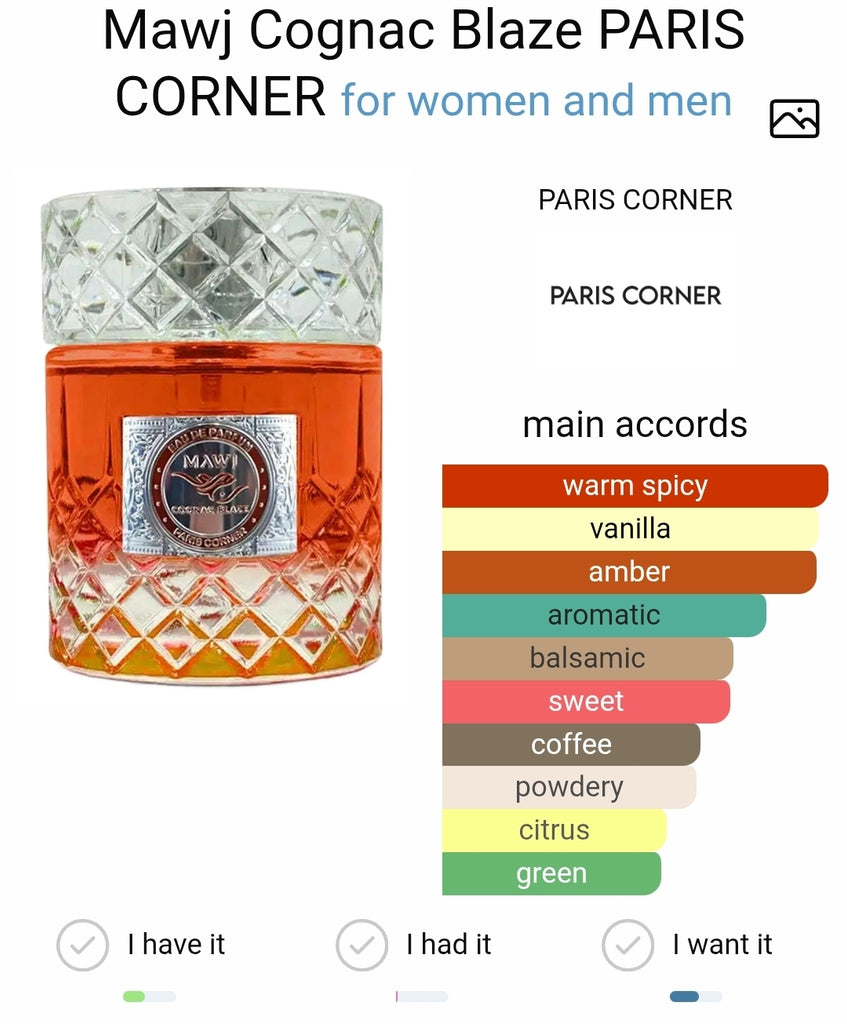Mawj Cognac Blaze by PARIS CORNER is a fragrance for women and men. Mawj Cognac Blaze was launched in 2024
